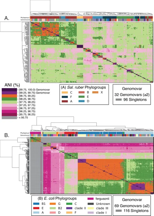 Все против всех значения ANI (Average Nucleotide Identity — средняя идентичность нуклеотидов) были вычислены для Sal. ruber (A) и E. coli и родственных видов (E. fergusonii/Escherichia clades I-III) (B) с использованием FastANI с настройками по умолчанию. Иерархическая кластеризация была выполнена с использованием средней связи на основе евклидовых расстояний. Филогруппы были определены из конкатенированного дерева основных генов для каждого вида и с помощью ClermonTyping (см. ключ к рисунку для подробностей). Присвоение геномовар было сделано на основе значений ANI (см. ключ к рисунку). Цитирование: Conrad, R.E., Brink, C.E., Viver, T. et al. Microbial species and intraspecies units exist and are maintained by ecological cohesiveness coupled to high homologous recombination. Nat Commun 15, 9906 (2024). https://doi.org/10.1038/s41467-024-53787-0