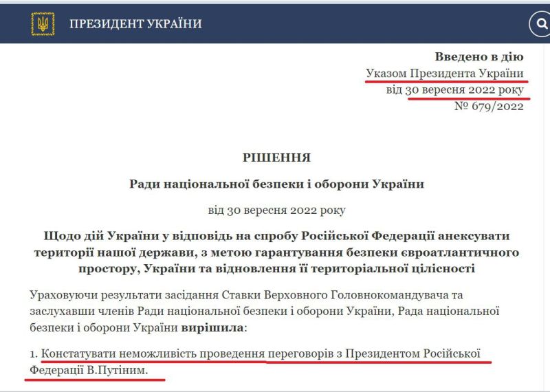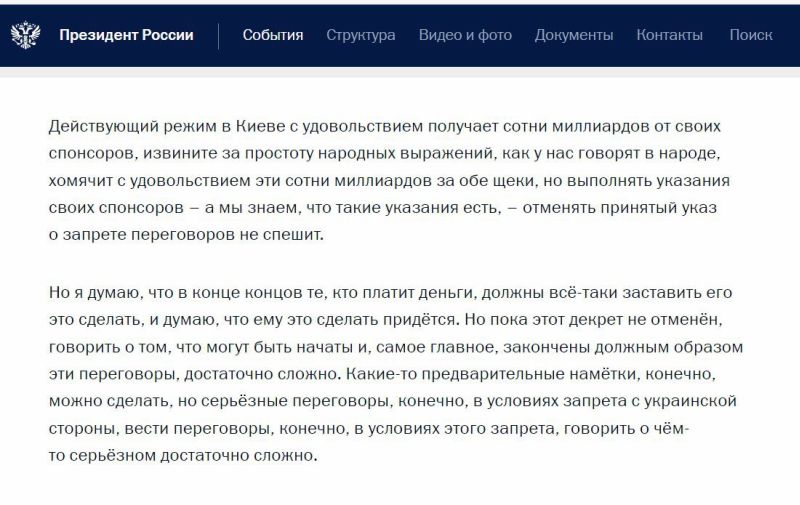 Путин напомнил, что киевский режим получает сотни миллиардов от своих спонсоров, «хомячит с удовольствием эти сотни миллиардов за обе щёки, но выполнять указание своих спонсоров – отменять указ о запрете переговоров – не спешит». Российский лидер считает, что США и их союзники должны заставить Зеленского отменить этот документ.
