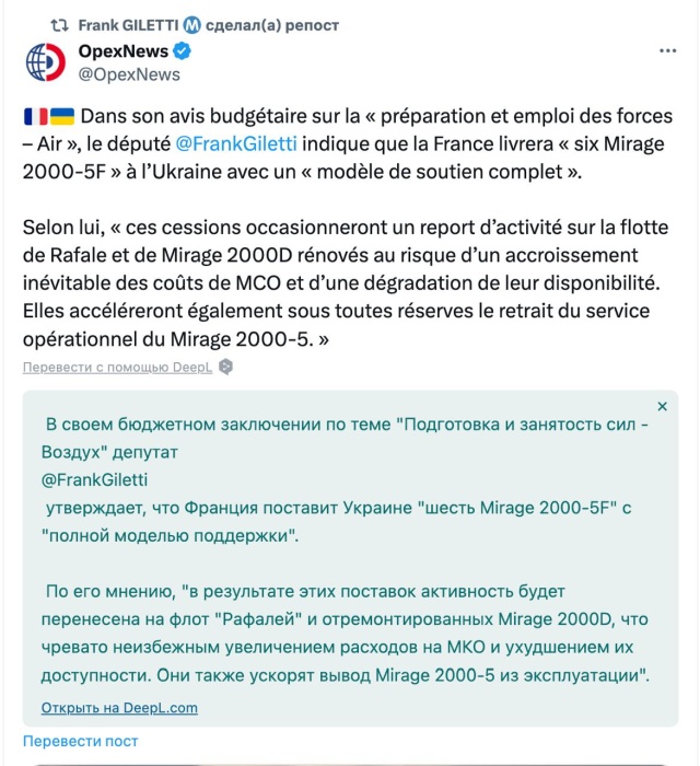 «Скоро над Украиной будут летать французские Mirage. В конце квартала, как объявил президент республики», — заявил глава МИД Франции.