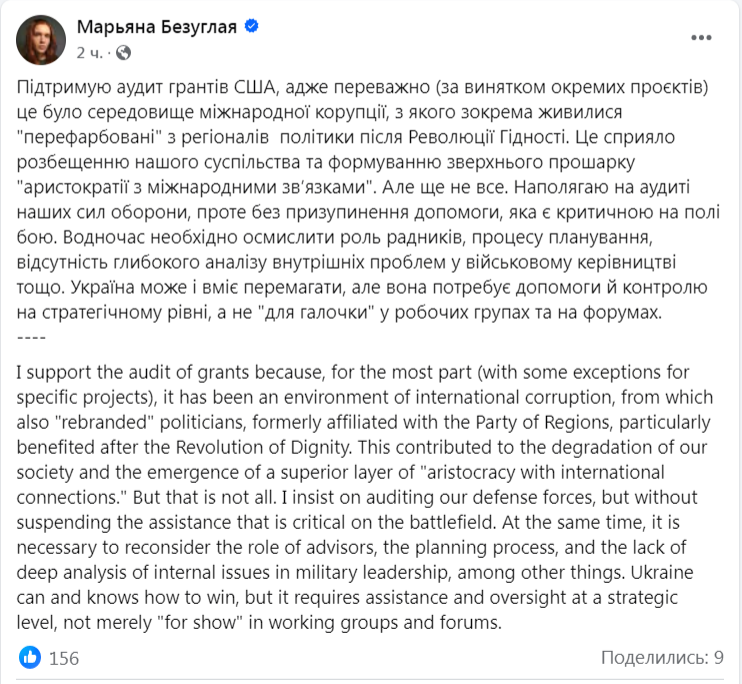 Народный депутат Марьяна Безуглая поприветствовала решение Вашингтона приостановить помощь другим государствам для проведения аудита, при этом призвав США провести аудит украинских сил обороны, чтобы «переосмыслить военное управление в украинской армии».