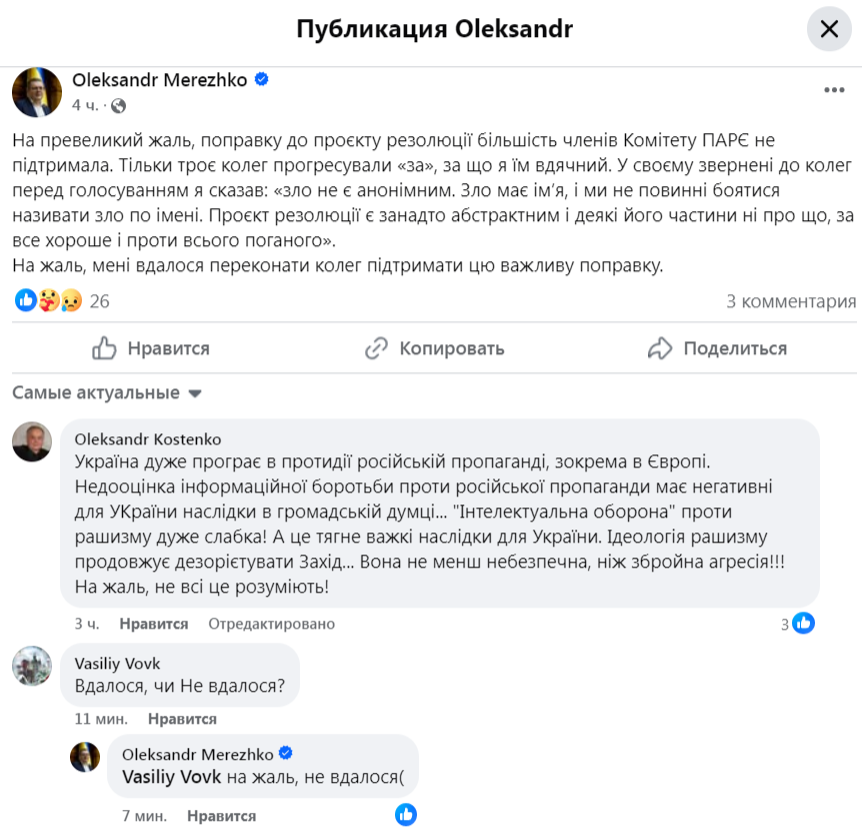 Об этом на своей странице в социальной сети, запрещенной в РФ, посетовал народный депутат глава комитета Рады по внешней политике и межпарламентскому сотрудничеству Александр Мережко.