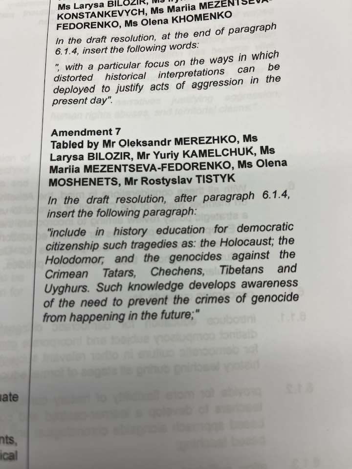 «Я был на заседании Комитета ПАСЕ, чтобы защитить наше предложение к проекту резолюции. Оно предусматривало обязательное изучение трагедии Голодомора и других геноцидов в европейских школах», — отметил Мережко.