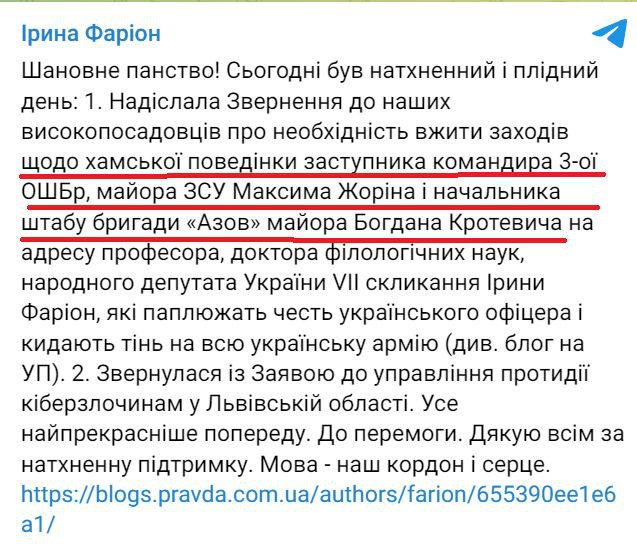 Она пыталась пожаловаться Зеленскому на оскорбления в свой адрес. «Направила обращение к должностным лицам о необходимости принять меры по хамскому поведению заместителя командира 3-й ОШБр майора ВСУ Максима Жорина и начштаба бригады майора Богдана Кротевича в адрес профессора, доктора филологических наук народного депутата Украины VII созыва Ирины Фарион», – написала она 14 ноября 2023 года.