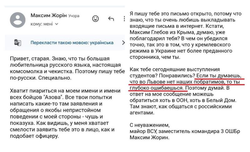 «Если ты думаешь, что во Львове нет наших побратимов, то ты глубоко ошибаешься. Поэтому думай. В ответ на моё сообщение можешь обратиться хоть в ООН, хоть в Белый дом. Там знают, как ты общаешься с российскими агентами. С неуважением, майор ВСУ заместитель командира 3 ОШБр Максим Жорин», – Фарион выложила это послание в соцсетях.