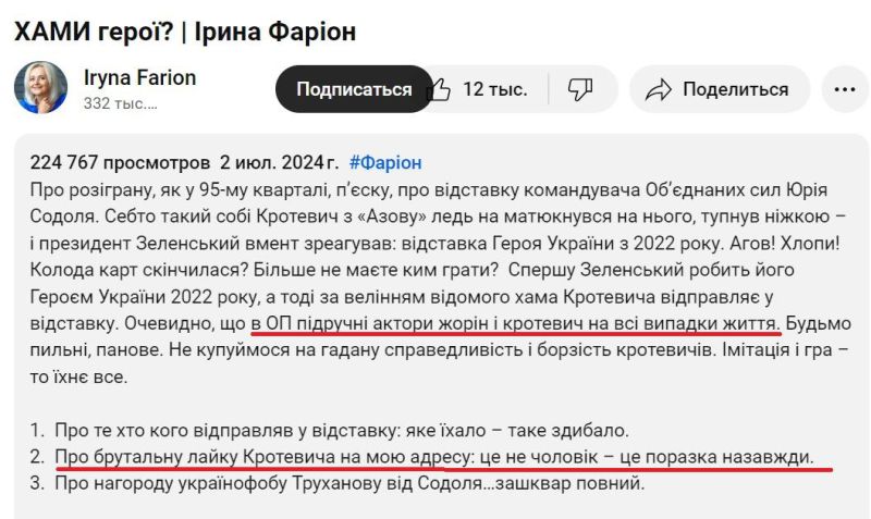 Фарион была уверена, что азовцы по команде Зеленского бросаются на всех его оппонентов. Она сказала, что отставка командующего Объединёнными силами ВСУ Юрия Содоля, который не угодил диктатору, была срежиссирована, а руководство «Азова»* поучаствовало «в пьеске, разыгранной в 95-м квартале».