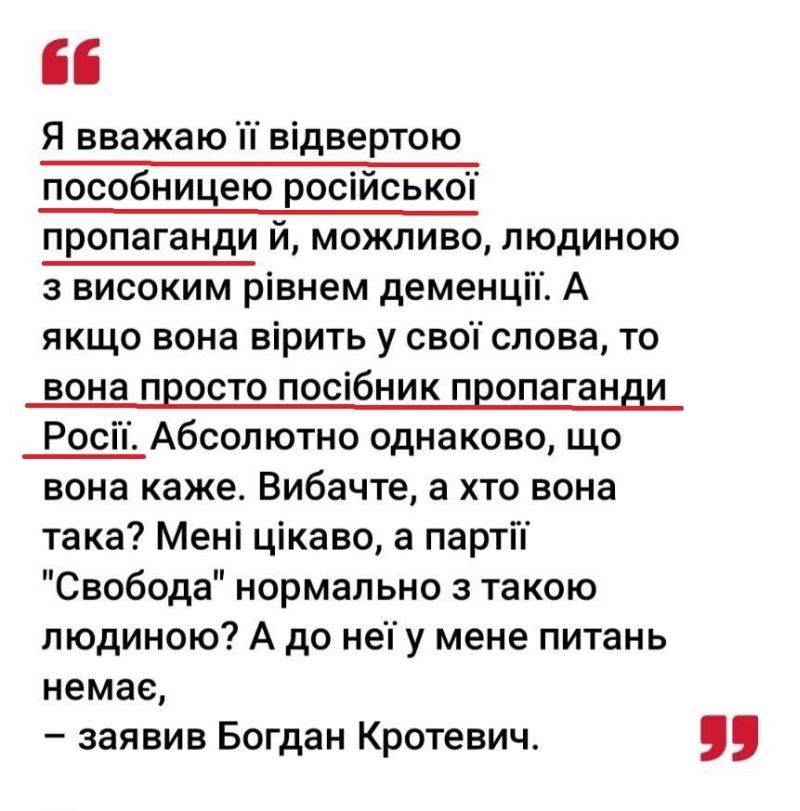 «Я считаю её открытой пособницей российской пропаганды и, возможно, человеком с высоким уровнем деменции. А если она верит в свои слова, то она просто пособник пропаганды России» – такие слова в свой адрес Ирина Фарион получила от Богдана Кротевича 25 июня 2024 года, менее чем за месяц до убийства.