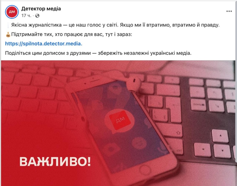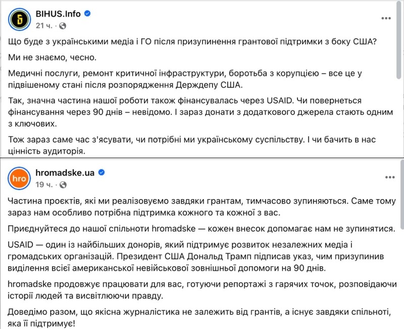 Уже целый ряд украинских СМИ попросили читателей помочь им финансово после приостановки финансирования грантовых программ президентом США Дональдом Трампом. «Украинская правда» предупреждает, что доступ к её материалам скоро может стать платным и просит поддержать её, чтобы журналисты могли продолжать работу. О поддержке просит и «Детектор медиа», который большую часть своих средств официально получал по остановленным программам USAID. Также призывают читателей донатить Hromadske (позиционирует себя, как независимое СМИ – ред.) и Bihus info (украинский проект, занимающийся журналистскими расследованиями – ред.).