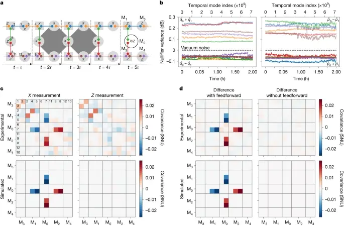 a, Графическое представление состояния 12-модового кластера. Для каждого временного окна (t) запутанные пары (цветные точки, соединенные сплошной линией) охватывают соседние макроноды. Метки режимов (макроузлов) даются на первом (пятом) временном шаге, а τ - это тактовый период эксперимента. Одно измерение гомодина на макронод программируется, остальные измеряются в. Для пар мод (3, 4) и (9, 10) одна из мод была задержана во времени, что позволяет вычислениям и запутыванию сохраняться во времени. и представляют квадратурный оператор положения и импульса, соответственно. b, Вариации нуллификатора в зависимости от времени. Применив обратное линейное преобразование сети пучков макронода к измеренным квадратурным исходам, мы получили квадратурные значения, соответствующие шести отдельным запутанным парам до взаимной интерференции. Нулификаторы этих состояний (сплошные линии) имеют вид (левая панель) и (правая панель). Их дисперсия поддерживается на уровне ниже шума вакуума в течение 2 ч непрерывной съемки (что соответствует 86,4 млрд мод, произведению 7,2 млрд временных мод на 12 пространственных мод) при тактовой частоте 1 МГц. Операторы (левая панель) и (правая панель) являются операторами, относящимися к антисжатым направлениям двухмодового сжатого состояния, и их дисперсии (слабые линии) находятся выше шума вакуума в течение всего времени наблюдения. c, Адаптивные возможности. Метки X, Z и X/Z в a определяют базу измерений для программируемого гомодинного измерения в каждом макроузле, соответствующую, или, или, соответственно. В этой схеме измерений измеряются два оператора проверки кода повторения четырех тел (с поддержкой двух темно-серых ромбов в a). Эта схема измерений повторяется, и данные гомодина собираются для 12 мод на каждом пятом временном шаге. Отдельные ковариационные матрицы построены из данных, когда мода M0 измеряется в X (слева) и в Z (справа). Строки и столбцы матрицы обозначены в соответствии с нумерацией мод в а. Одномодовая дисперсия на диагоналях была удалена для лучшего контраста, а значения ковариации представлены в единицах дробового шума (SNU) — единицах, в которых вакуум имеет дисперсию 1 и ℏ = 2. d, контрольный эксперимент. Разница между ковариационными матрицами, соответствующими решениям декодера по измерению базисов X и Z, показанным в c (слева, «с обратной связью»), и идентичным экспериментом, в котором измеряемый базис определяется случайным выбором, а не решением декодера (справа, «без обратной связи»). Цитирование: Aghaee Rad, H., Ainsworth, T., Alexander, R.N. et al. Scaling and networking a modular photonic quantum computer. Nature (2025). https://doi.org/10.1038/s41586-024-08406-9