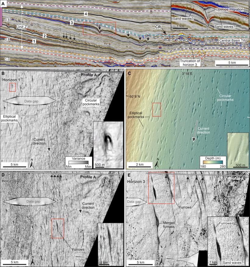 Вытянутые формы рельефа на горизонтах 1-3, выявленные по данным 3D-сейсморазведки. (A) Деталь сейсмического профиля на рис. 2Открывается в программе просмотра изображений. Фиолетовая полоса показывает диапазон горизонтов, интерпретированных Rea et al. (16) (их рисунок S6) как вмещающие MSGLs. (B) Карта вариационного атрибута горизонта 1, показывающая особенности, интерпретируемые как эллиптические ямки. (C) Аналогичные эллиптические ямки на современном морском дне в западной части Норвежского канала. Обратите внимание, что южное течение, сформировавшее эти отметки, противостоит северному направлению ледового потока, занимавшего Норвежский канал. Батиметрические данные, Kartverket. Размер ячейки сетки 5 м. (D и E) Карты вариационных атрибутов горизонтов 2 и 3, соответственно, показывающие особенности, интерпретируемые как борозды контурного течения. Черные стрелки соответствуют стрелкам в (A). Цитирование: Dag Ottesen et al., 3D seismic evidence for a single Early Pleistocene glaciation of the central North Sea.Sci. Adv.10,eadq6089(2024).DOI:10.1126/sciadv.adq6089