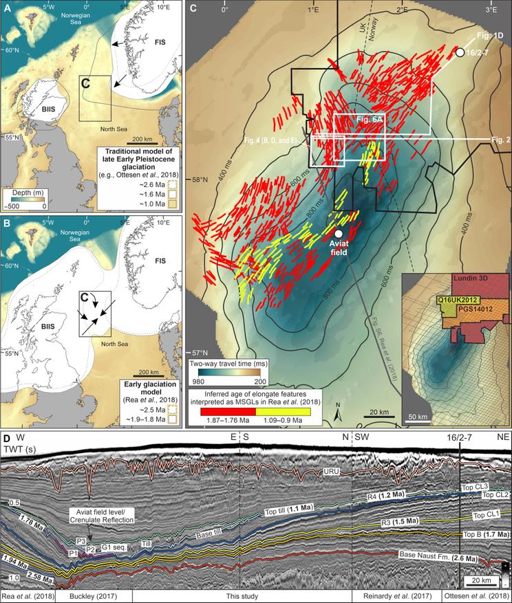 Район исследования в центральной части Северного моря. (A) Протяженность Фенноскандского ледникового щита (ФЛЩ) и Британско-Ирландского ледникового щита (БИЛЩ) в модели позднераннеплейстоценового оледенения (15 здесь и далее см. ориг. исследование). Эта модель демонстрирует ограниченное оледенение на ранних холодных стадиях раннего плейстоцена, а наземные льды впервые распространились по центральной части Северного моря во время среднеплейстоценового перехода (СПП; 1,3-0,7 млн лет назад). (B) Протяженность ледникового покрова в модели раннего оледенения (16), в которой считается, что ФИС и БИИС сливались во время ранних холодных стадий раннего плейстоцена (~1,9-1,8 млн лет назад). Черными стрелками показаны направления ледохода. Батиметрия представлена глобальной моделью рельефа ETOPO1 1-арк мин [90]. (C) Расположение наборов трехмерных (3D) сейсмических данных, использованных в данном исследовании (черная линия). Фоновая структурная карта показывает морфологию конечной части центрального бассейна Северного моря, подлежащей заполнению [верхняя поверхность клиноформной единицы 3 по Ottesen et al. (15)]. Контуры нанесены через каждые 100 мс. Красные и желтые линии показывают расположение погребенных удлиненных объектов, которые ранее были интерпретированы как мегамасштабные ледниковые линии (MSGLs) [16]. На вставке показаны 2D сейсмические профили (серые линии) и 3D сейсмические данные (заполненные области), использованные в данном исследовании. (D) Сейсмическая привязка датированных горизонтов. CL — клиноформная единица; G1 — гляциогенная осадочная последовательность Бакли (31); P1 — P3 — заметные отражения Бакли (31); TWT — время двустороннего пробега; URU — верхнее региональное несоответствие. Данные от компании TGS. Цитирование: Dag Ottesen et al., 3D seismic evidence for a single Early Pleistocene glaciation of the central North Sea.Sci. Adv.10,eadq6089(2024).DOI:10.1126/sciadv.adq6089