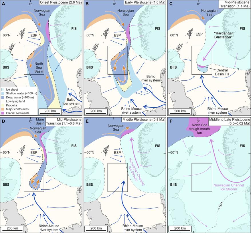 Схематические карты морфологии бассейна и маршрутизации осадочного материала в Северном море в плейстоцене. (A) Начальный плейстоцен ~2,6 млн лет, (B) Ранний плейстоцен ~1,6 млн лет, (C) МПТ ~1,1 млн лет, (D) МПТ ~1,1-0,8 млн лет, (E) ранний средний плейстоцен ~0,8 млн лет, и (F) средний-поздний плейстоцен ~0,5-0,02 млн лет. Оранжевые стрелки показывают предполагаемое направление циркуляции воды. Синие стрелки показывают местоположение крупных рек (флювиальных и гляцифлювиальных). Фиолетовые стрелки показывают образование ледниковых отложений. Пунктирная черная линия — очертания четвертичного Северного моря в периоды понижения уровня моря (ледниковые периоды). Черная рамка — район наших исследований, как на рис. 1Содержится в программе просмотра изображений. ESP — Восточно-Шетландская платформа; LGM — последний ледниковый максимум. Цитирование: Dag Ottesen et al., 3D seismic evidence for a single Early Pleistocene glaciation of the central North Sea.Sci. Adv.10,eadq6089(2024).DOI:10.1126/sciadv.adq6089