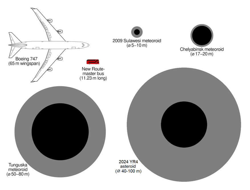 А что же может произойти, если столкновение все же произойдёт? Это во многом зависит от размера и состава астероида. Сейчас, на основе его яркости, предполагается, что диаметр 2024 YR4 может варьироваться от 40 до 100 метров.