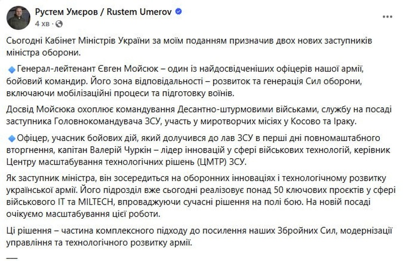 Еще одним заместителем Умерова назначен офицер, участник боевых действий Валерий Чуркин. По словам Умерова, он лидер инноваций в сфере военных технологий, руководитель Центра масштабирования технологических решений ВСУ. В качестве заместителя министра обороны он будет заниматься оборонными инновациями и технологическим развитием ВСУ.