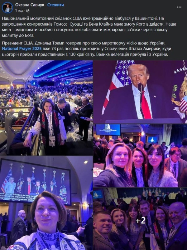 В этом году Украина направила самую большую в истории делегацию на встречу влиятельных христианских лидеров в Вашингтоне, известную как Национальный молитвенный завтрак. По информации экс-нардепа Павла Унгурян, более 100 украинских пасторов, политиков, военных капелланов и священников, включая главу раскольнической УПЦ митрополита Епифания I, приехали на молитвенный завтрак и связанные с ним мероприятия, которые проходят в течение недели.
