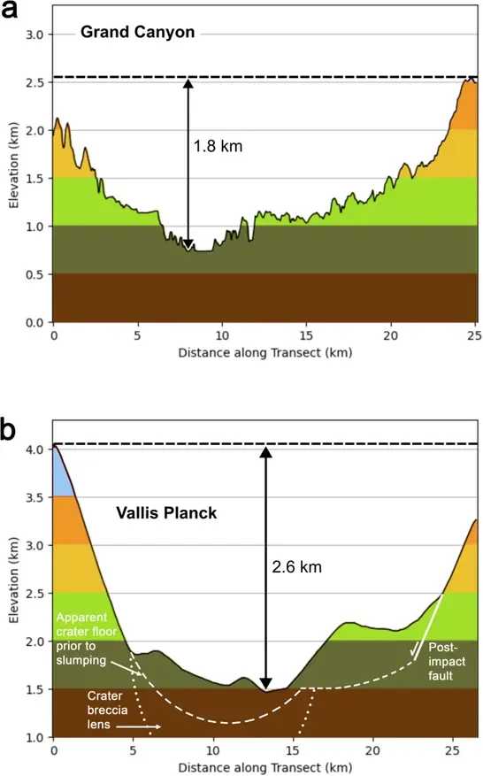 Эти «шрамы», получившие имена долина Шрёдингера и долина Планка, — не просто впечатляющие геологические образования. Это — ключи к пониманию бурного прошлого нашего спутника. Долина Шрёдингера, к примеру, вытянулась почти на 300 километров, достигая 20 километров в ширину и 2,7 километра в глубину. Долина Планка — еще более сложная структура. Она состоит из глубокого каньона, «вписанного» в покров выброшенных при ударе пород, и целой цепочки вторичных кратеров — следов от падения этих самых обломков. Глубина каньонной части долины Планка — около 3,5 километров, а ширина достигает 27 километров! Для сравнения: эти показатели значительно превосходят параметры Большого Каньона в Аризоне.