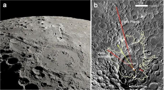 Ученые предполагают, что небесное тело врезалось в Луну на скорости, близкой к 55 000 км/ч. Результатом стал ударный бассейн Шрёдингера — гигантская «чаша» диаметром 320 километров. Интересно, что сам бассейн Шрёдингера находится внутри еще более древнего и крупного образования — бассейна Южный полюс — Эйткен (его диаметр — около 2400 км!). Это, к слову, самый большой и самый старый известный ударный бассейн на Луне.