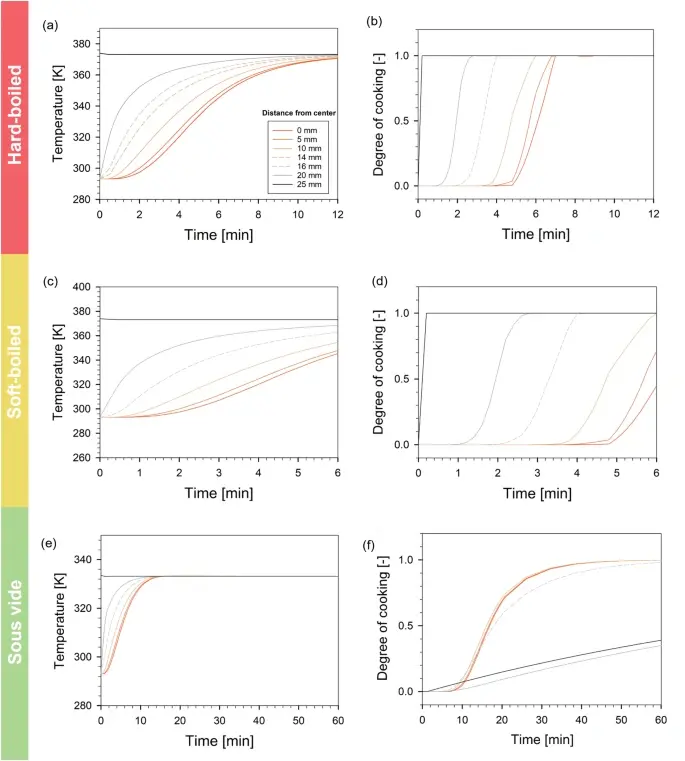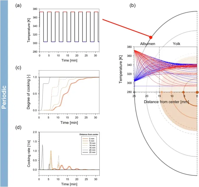 Оказалось, что при таком периодическом воздействии температура внутри яйца меняется весьма хитрым образом. В то время как белок подвергается «температурным шокам», желток, находящийся в центре, нагревается более равномерно и достигает оптимальной температуры около 67°C. А белок, благодаря «качелям», успевает полностью «схватиться», не перевариваясь.