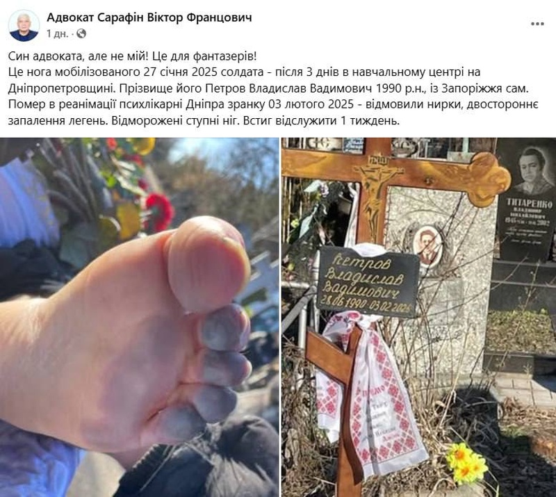 Вскоре выяснилось, что Владислав Петров был сыном адвоката из Запорожья Людмилы Петровой, которая вначале в соцсетях заявила, что ее сын погиб после того, как прошел через руки сотрудников ТЦК, а после скрыла эту публикацию. Но другой адвокат, Виктор Сарафин, опубликовал фотографию с похорон погибшего. На кадрах видно, что у мужчины были серьезные обморожения, а пальцы на ногах почернели.