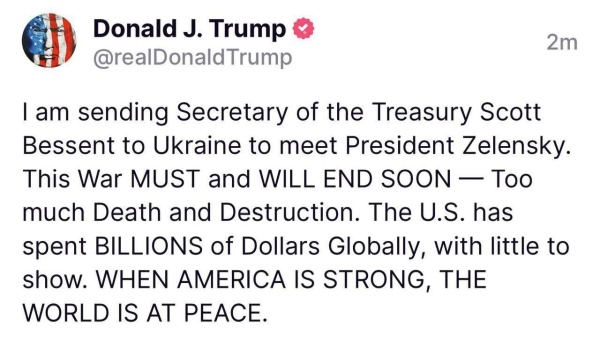 Ранее СМИ сообщили о визите Бассента на Украину. По данным Bloomberg, Бессент намерен посетить Украину на этой неделе в рамках начальных переговоров по обеспечению доступа США к критически важным полезным ископаемым.