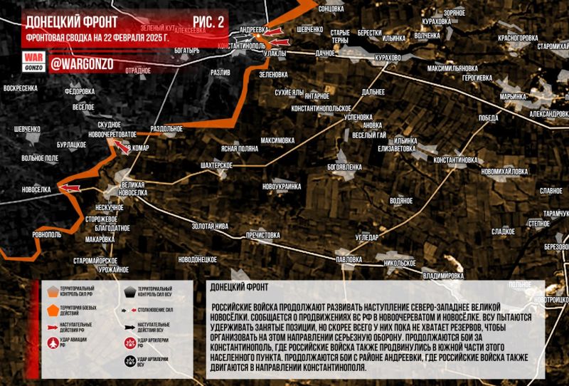 ДОНЕЦКИЙ ФРОНТ. Российские войска продолжают развивать наступление северо-западнее Великой Новосёлки. Сообщается о продвижениях ВС РФ в Новоочереватом и Новосёлке. ВСУ пытаются удерживать занятые позиции, но скорее всего у них пока не хватает резервов, чтобы организовать на этом направлении серьёзную оборону. Продолжаются бои за Константинополь, где российские войска также продвинулись в южной части этого населенного пункта. Продолжаются бои с районе Андреевки, где российские войска также двигаются в направлении Константинополя. (Рис. 2)