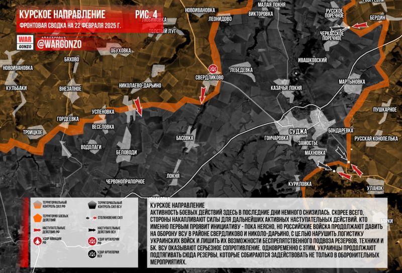 КУРСКАЯ ОБЛАСТЬ. Активность боевых действий здесь в последние дни немного снизилась. Скорее всего, стороны накапливают силы для дальнейших активных наступательных действий. Кто именно первым проявит инициативу – пока неясно, но российские войска продолжают давить на оборону ВСУ в районе Свердликово и Николо-Дарьино с целью нарушить логистику украинских войск и лишить их возможности беспрепятственного подвоза резервов, техники и БК. ВСУ оказывают серьёзное сопротивление. Одновременно с этим украинцы продолжают подтягивать сюда резервы, которые собираются задействовать не только в оборонительных мероприятиях. (Рис. 4)