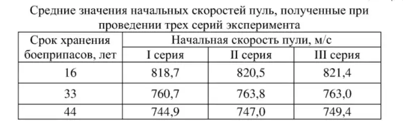 По паспорту начальная скорость 7,62-мм пуль пулемёта Калашникова составляет 825 метров в секунду при использовании нового ствола и свежих патронов. И, надо отметить, пролежавшие 16 лет на складе патроны почти укладывались в этот норматив — скорость их пуль составила около 820 метров в секунду. 36-летние патроны давали в среднем уже около 760 м/с, а 44-летние — в пределах 750 метров в секунду.