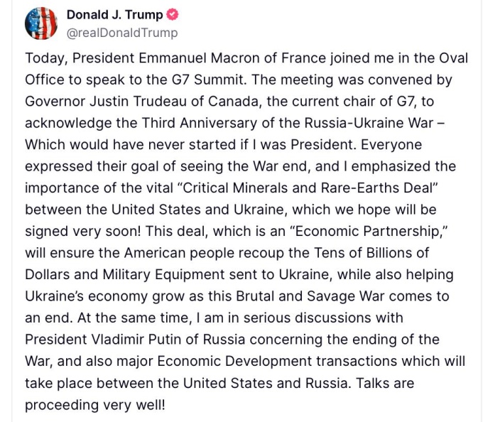 «Я подчеркнул важность жизненно важной «Сделки о критически важных минералах и редкоземельных элементах» между Соединенными Штатами и Украиной, которая, как мы надеемся, будет подписана очень скоро! Эта сделка, которая является «Экономическим партнерством», гарантирует, что американский народ вернет десятки миллиардов долларов и военное оборудование, отправленные на Украину, а также поможет экономике Украины расти, поскольку эта жестокая и дикая война подходит к концу», — написал Трамп в своей соцсети.
