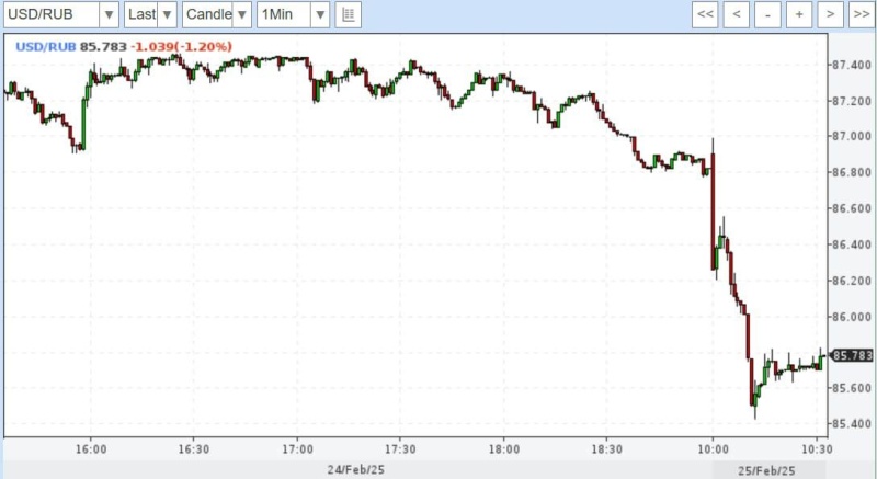 25 февраля курс доллара на российском межбанковском рынке опустился ниже отметки 86 рублей, достигнув 85,59 рублей, впервые с 3 сентября 2024 года. Об этом свидетельствуют данные с торговых площадок.