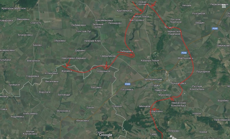«На рубеже Журавка — Свердликово ВС РФ постепенно расширяют зону контроля в лесополосах в направлении Новенького. Более того, поступает информация о расширении вклинения в Сумскую область, однако она пока не подтверждается ни кадрами объективного контроля, ни нашими источниками. Продолжаются бои в Лебедевке Суджанского района, где к северо-востоку от Свердликово российские десантники с боями продвигаются в границах населенного пункта, прорываясь к восточной окраине», — говорится в публикации.