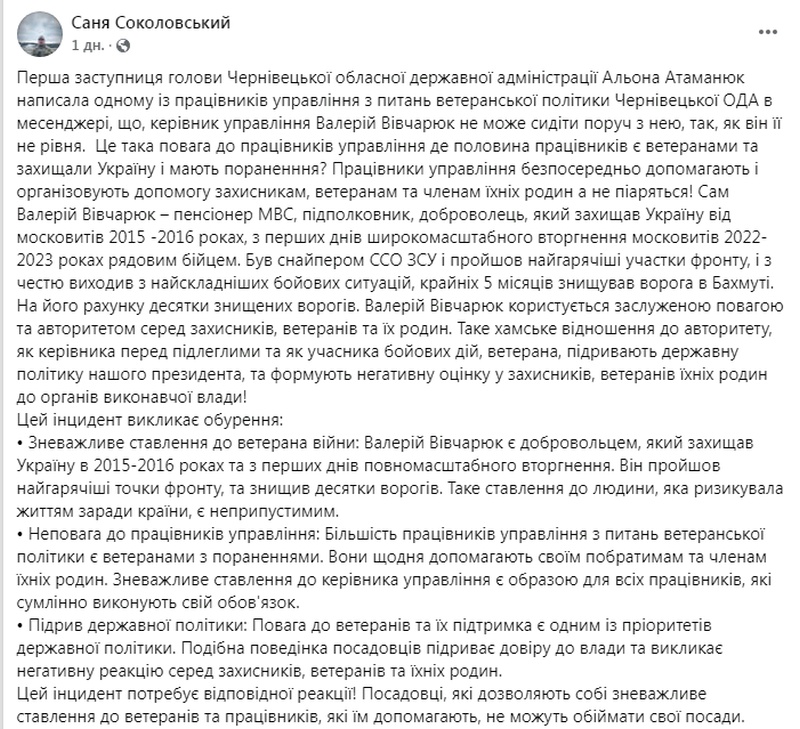 На одном из мероприятий первый заместитель председателя Черновицкой ОВА Алена Атаманюк не пожелала сидеть рядом с ветераном Виталием Вивчарюком, поскольку «он ей не ровня».