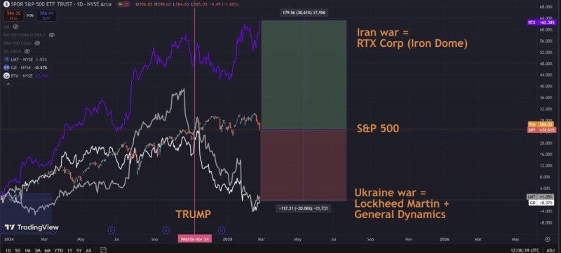 «Что интересно: акция, которая считается «прокси на прокси-войну с Ираном» из-за «авторства» израильского Железного Купола и дорогущих «расходников» на него — т. е. Raytheon (RTX Company) [NYSE: RTX] — фиолетовая линия — вообще не была задета распродажами и, наоборот, растёт и пухнет, т. е. это не про сокращение военного бюджета или ротацию инвесторов из сектора ВПК в целом. Это, скорее всего, ставка именно на то, что с Ираном у США (ради Израиля) всё только начинается, а с Украиной, скорее, ближе к концу, чем к началу. Уолл-стрит периодически ошибается, у него тоже нет хрустального шара, но деньги поставлены именно на такой исход», — резюмировали авторы.