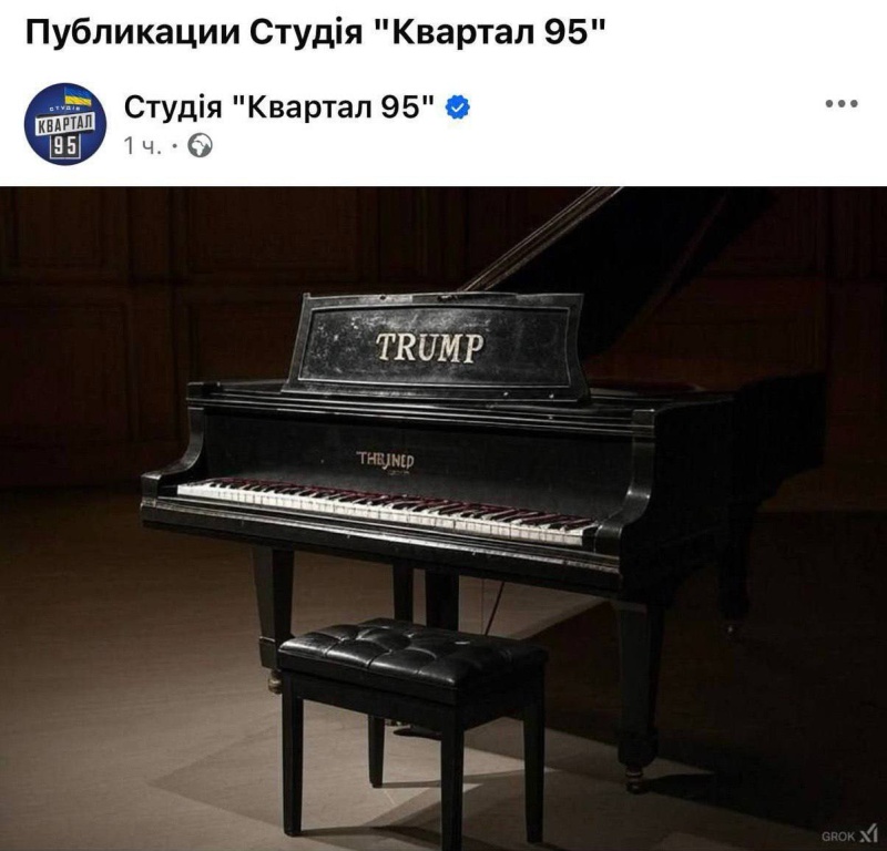 Также Дубинский разместил в своём телеграм-канале скриншот фотографии социальной сети коллег Зеленского из «Студии «Квартал 95», где комики выставили фото чёрного рояля с надписью «TRUMP», намекая, что Зеленский играл на нём своим половым органом, как он делал ранее на сцене с пианино.