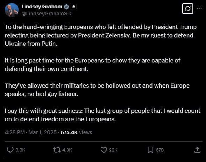 «Тем, кто в Европе сокрушается из-за того, что Трамп отказался выслушивать нравоучения Зеленского: пожалуйста, сами защищайте Украину от Путина. Давно пора европейцам показать, что они способны защищать свой собственный континент. Они допустили упадок своих вооружённых сил, и когда Европа что-то говорит, ни один злодей её не слушает. С грустью говорю: последние, на кого я бы рассчитывал в деле защиты свободы, — это европейцы», — написал Грэм в соцсети Х после того, как Трамп вышвырнул Зеленского из Белого дома.