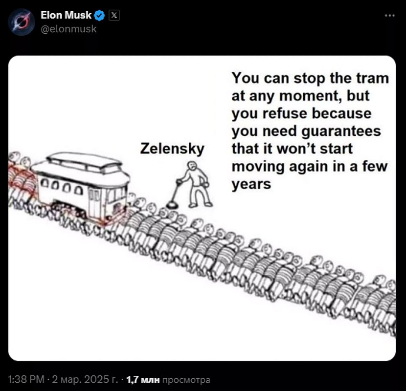 На изображении Зеленский держит рычаг, которым может остановить движущийся по людям поезд. Маск подчеркнул, что украинский лидер отказывается это сделать.