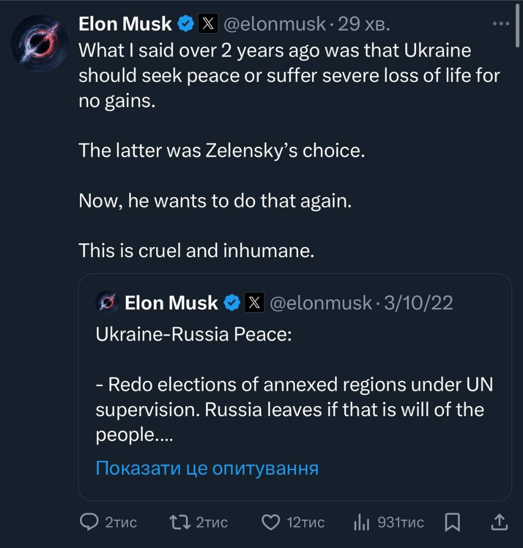 «Более 2 лет назад я сказал, что Украина должна прийти к миру, иначе она потеряет множество жизней, ничего не получив. Последнее было выбором Зеленского. Теперь он хочет сделать это снова. Это жестоко и бесчеловечно», - отметил Илон Маск.