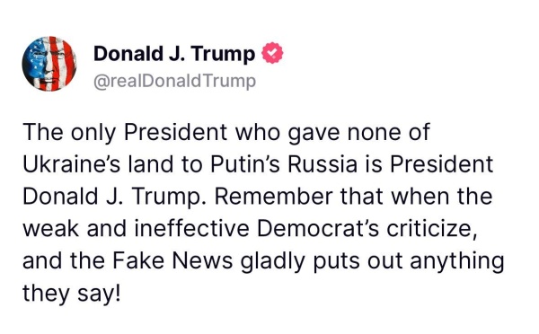 «Единственный президент, который не отдал ни одной земли Украины Путинской России, — это президент Дональд Трамп. Помните, когда слабые и неэффективные демократы критикуют, а фейковые новости с радостью выкладывают все, что они говорят!» — написал Трамп в своей соцсети.