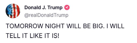 «Завтрашний вечер будет великим. Я скажу все как есть», — говорится в сообщении.