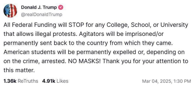 «Все федеральное финансирование будет прекращено для любого колледжа, школы или университета, где разрешены незаконные протесты. Подстрекатели будут заключены в тюрьму и/или навсегда отправлены в страну, из которой они прибыли. Американские студенты будут навсегда исключены или, в зависимости от преступления, арестованы. Ношение масок будет запрещено», — написал президент США.