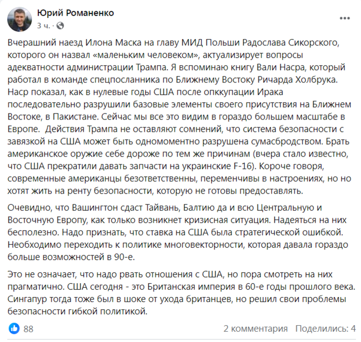 «Вчерашний наезд Илона Маска на главу МИД Польши Радослава Сикорского, которого он назвал «маленьким человеком» (в действительности Маск назвал Сикорского «человечком» - ред.) , актуализирует вопросы адекватности администрации Трампа. Я вспоминаю книгу Вали Насра, который работал в команде спецпосланника по Ближнему Востоку Ричарда Холбрука. Наср показал, как в нулевые годы США после оккупации Ирака последовательно разрушили базовые элементы своего присутствия на Ближнем Востоке, в Пакистане. Сейчас мы все это видим в гораздо большем масштабе в Европе», - сообщил политолог.