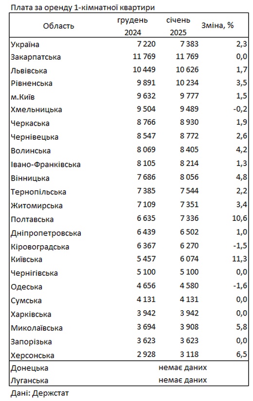 Согласно данным Государственной службы статистики (Госстата), средняя плата за месячную аренду 1-комнатной квартиры в феврале 2025 года составила 7 326 гривен. С начала года цены выросли на 1,5%.