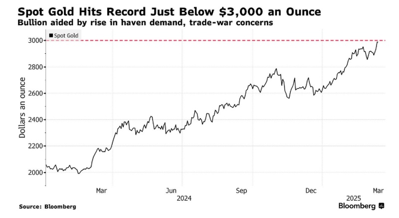 Цена на золото впервые достигла отметки в 3 тысячи долларов за унцию.Как сообщает Bloomberg, спотовое золото поднялось до 2994 долларов за унцию. Фьючерсы в Нью-Йорке, которые торгуются с премией к наличным ценам, уверенно превысили 3000 долларов за унцию.