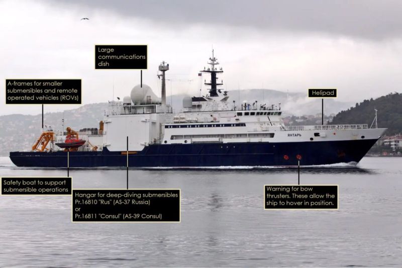 Подводные аппараты и ROV могут использоваться для работы с инфраструктурой морского дна, например, с интернет-кабелями. Кроме того, “Янтарь” может использовать свои бортовые и буксируемые гидролокационные системы для картирования морского дна», – пишет Naval News.