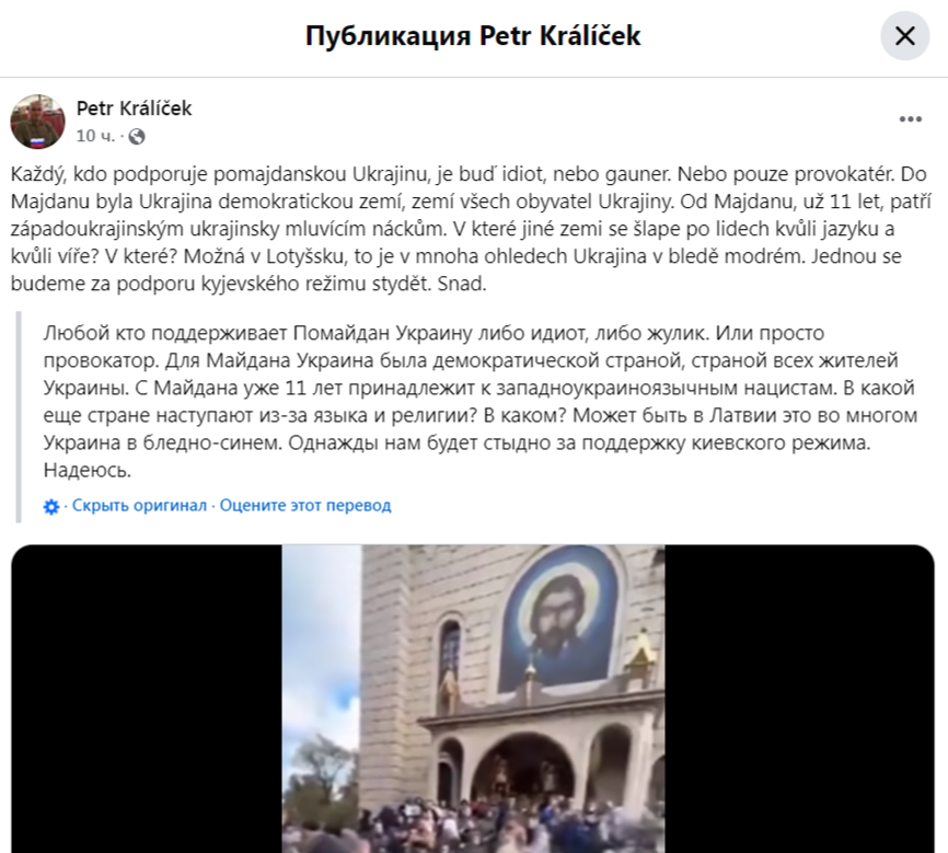 Он отметил, что те, кто поддерживает киевский режим, очень нехорошие люди – «идиоты, мошенники или провокаторы». Такое мнение Краличек выразил, комментируя одно из многочисленных видео, на котором запечатлен силовой захват украинскими националистами и военными очередного храма канонической Украинской православной церкви (УПЦ) в пользу новосозданной при Петре Порошенко в пику Москве сугубо «украинской» Православной церкви Украины (ПЦУ).