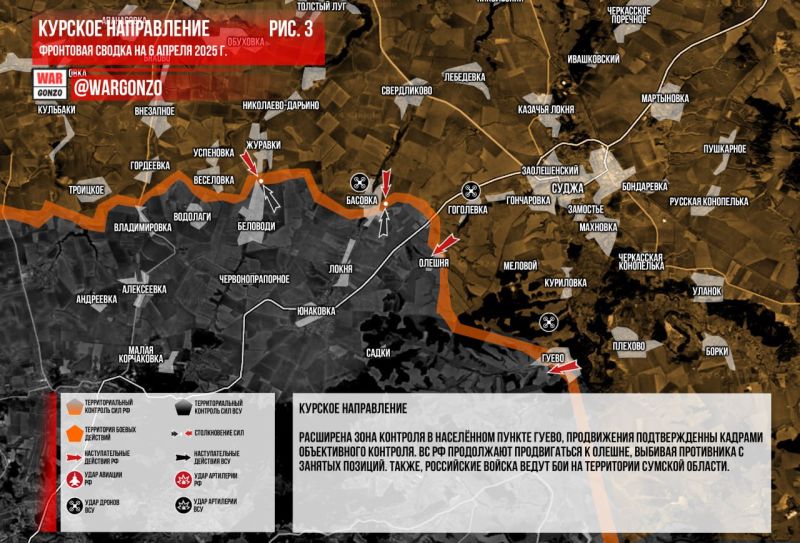 КУРСКАЯ ОБЛАСТЬ. Российские войска выбивают подразделения ВСУ из населённых пунктов Гуево и Олешня Курской области, рассказали в российских силовых структурах. Расширена зона контроля в населённом пункте Гуево, продвижения подтверждены кадрами объективного контроля. ВС РФ продолжают продвигаться к Олешне, выбивая противника с занятых позиций. Также российские войска ведут бои на территории Сумской области. Где подразделения ВСУ несут колоссальные потери, как рассказали в российских силовых структурах (с. Водолаги Сумской обл.) (Рис. 3)