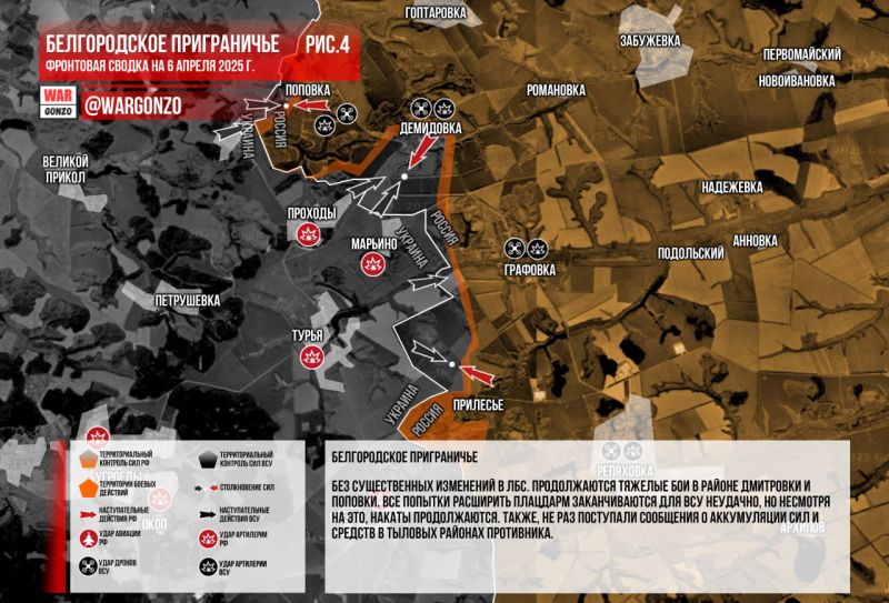 БЕЛГОРОДСКАЯ ОБЛАСТЬ. ВСУ за сутки атаковали территорию Белгорода и девяти районов Белгородской области с помощью 58 беспилотников, сообщил губернатор региона Вячеслав Гладков. Без существенных изменений в ЛБС. Продолжаются тяжёлые бои в районе Дмитровки и Поповки. Все попытки расширить плацдарм заканчиваются для ВСУ неудачно, но, несмотря на это, накаты продолжаются. Также не раз поступали сообщения об аккумуляции сил и средств в тыловых районах противника. (Рис. 4)