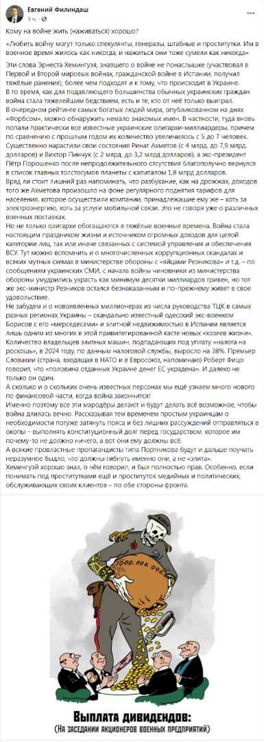 Украинский политик, экс-депутат двух созывов Верховной рады от Социалистической партии, директор Украинского центра социальной аналитики Евгений Филиндаш заявил что определенным категориям населения военный конфликт на Украине чрезвычайно выгоден, и они будут делать все возможное, чтобы война длилась вечно.