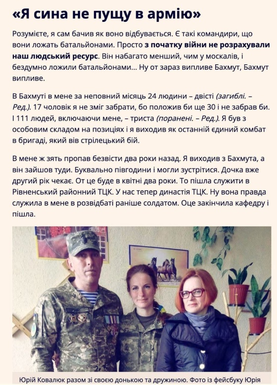 Ещё один «герой без плаща» - начальник отдела Дубенского районного ТЦК Ровенской области Юрий Ковалюк. Он публично заявил, что не допустит призыва своего сына в ВСУ.