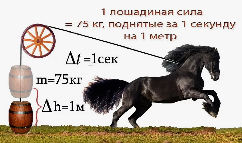 Проведя ряд наблюдений, Уатт вывел любопытные расчеты. Он заметил, что одна лошадь, вращая мельничное колесо, делает примерно 144 оборота за час. Две лошади, работая в шахте, могли поднимать бочку весом 180 кг. со скоростью чуть больше 3,5 км/ч. На основе этих данных он вывел усредненный показатель: если животное способно поднимать 75 кг. на высоту одного метра за секунду, значит, его мощность можно принять за единицу измерения.