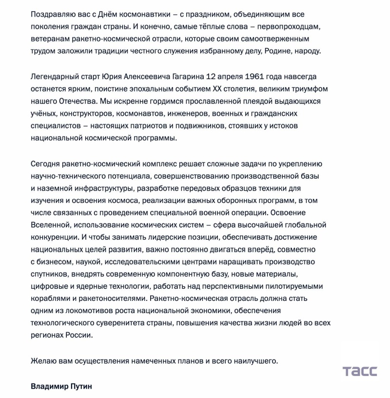 Президент РФ Владимир Путин поздравил работников и ветеранов космической отрасли с Днем космонавтики, сообщили в Кремле. Глава государства назвал прорыв Юрия Гагарина в космос эпохальным событием 20-го века и триумфом нашего Отечества.