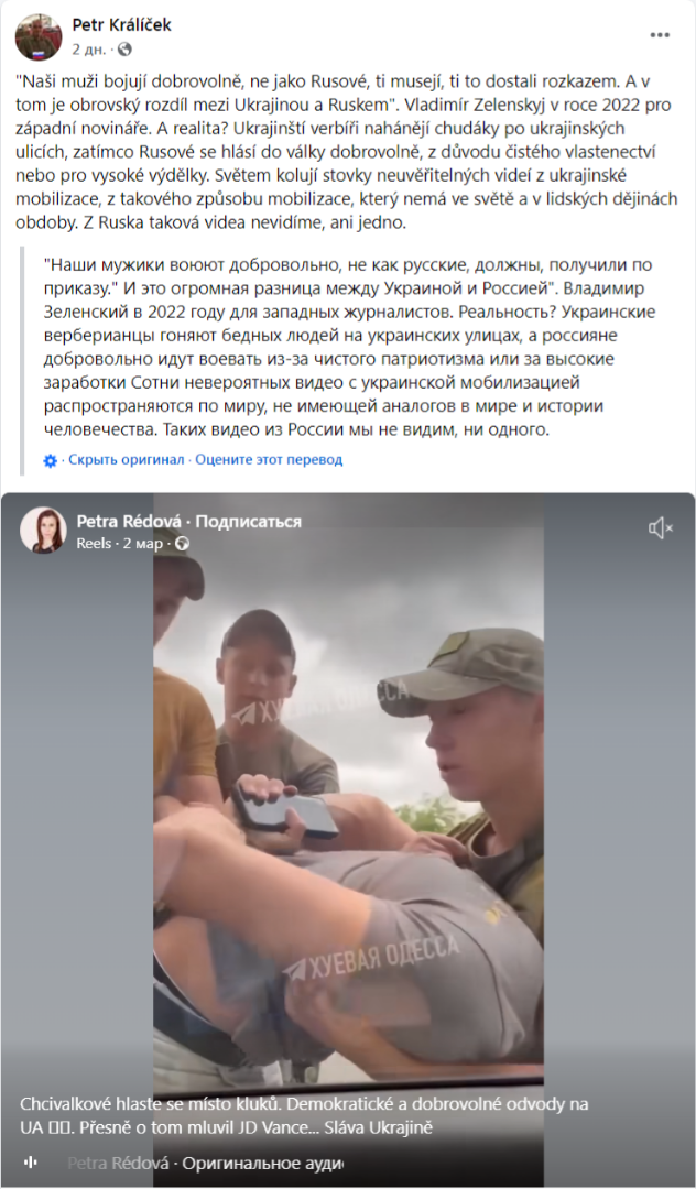 «А какова реальность? Украинские вербовщики гоняются за бедняками по улицам Украины, в то время как россияне добровольно идут на войну из чистого патриотизма или ради высоких заработков. По всему миру циркулируют сотни невероятных видеороликов украинской мобилизации, метода мобилизации, не имеющего прецедентов в мире и в истории человечества. Мы не видим ни одного подобного видео из России», - отметил Петр Краличек.